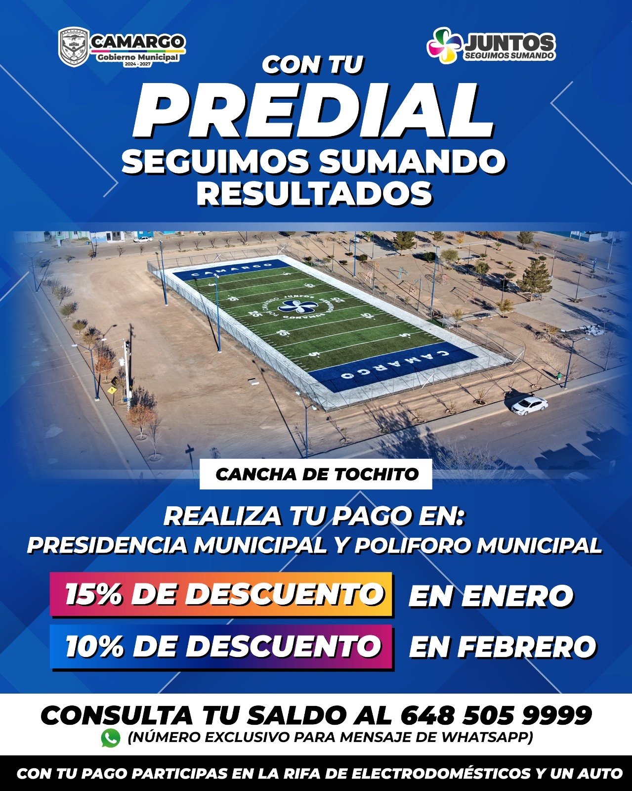 Aprovecha la última semana con el 15% de descuento en predial, con tu apoyo seguimos sumando resultados en Camargo