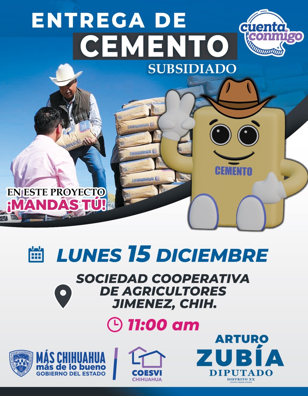 Cd. Camargo, chih., 15 de Diciembre de 2025.- Invitamos a los beneficiarios a la entrega de cemento subsidiado, que se realizará este lunes 15 de diciembre, a las 11:00 a.m., en la Sociedad Cooperativa de Agricultores de Jiménez, Chihuahua.