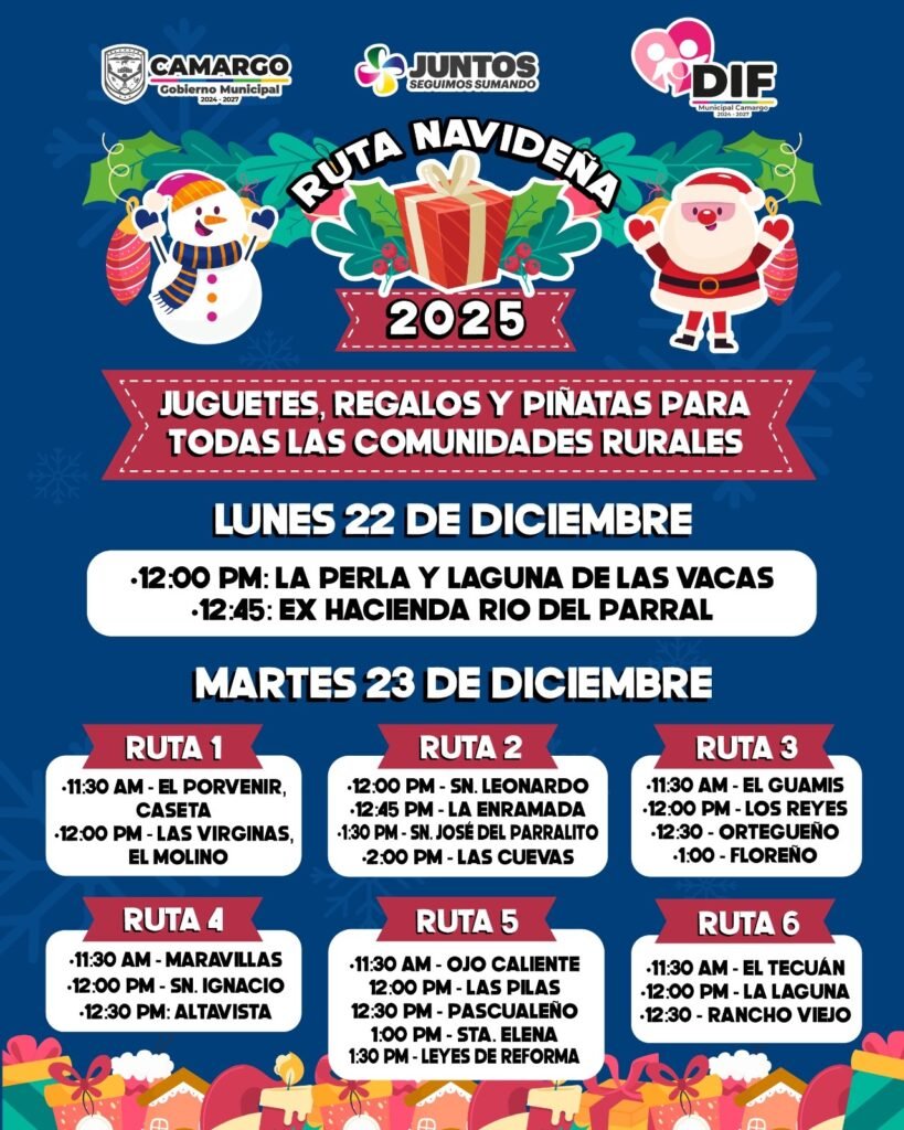 Cd. Camargo, Chih., 22 de Diciembre de 2025.- El Gobierno Municipal de Camargo, en coordinación con el DIF Municipal, llevará a cabo la Ruta Navideña 2025, una jornada de entrega de juguetes, regalos y piñatas dirigida a niñas y niños de todas las localidades rurales del municipio.