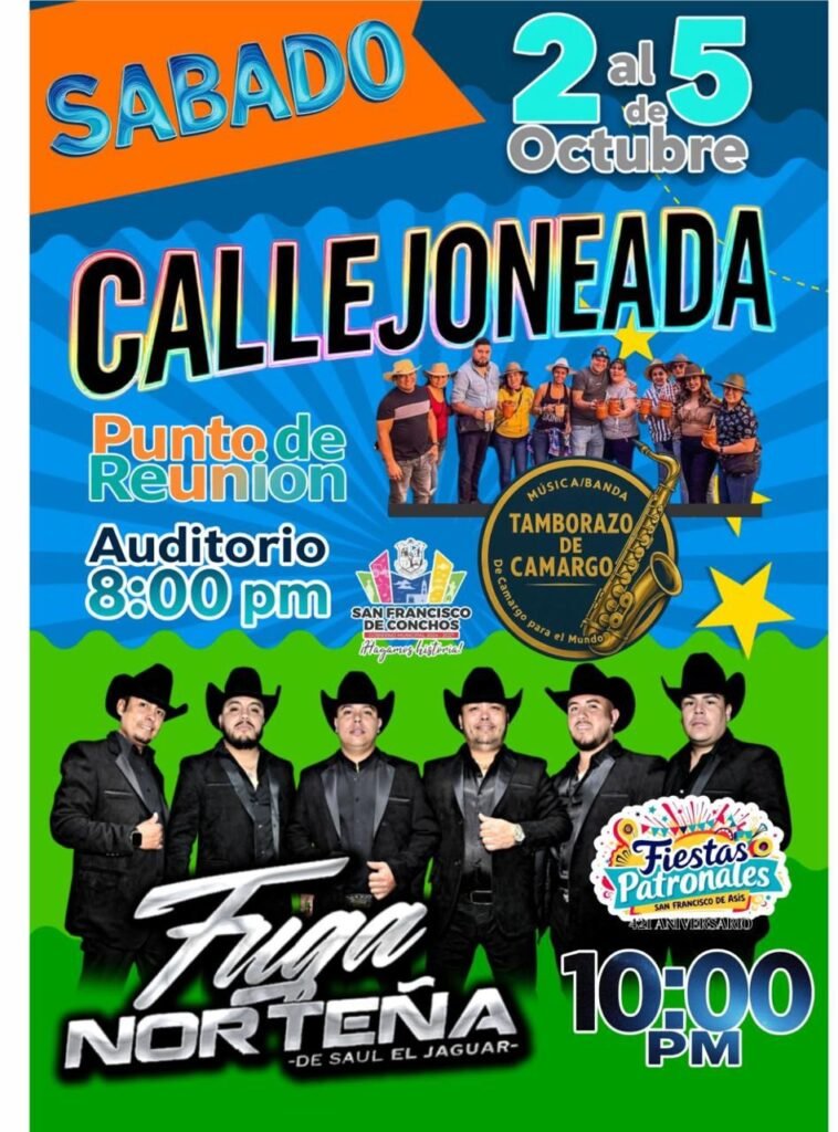 Callejoneada: La fiesta continúa por las calles del municipio con una Callejoneada que tendrá su Punto de Reunión en el Auditorio a las 8:00 PM, amenizada nuevamente por la Música de Banda del Tamborazo de Camargo.