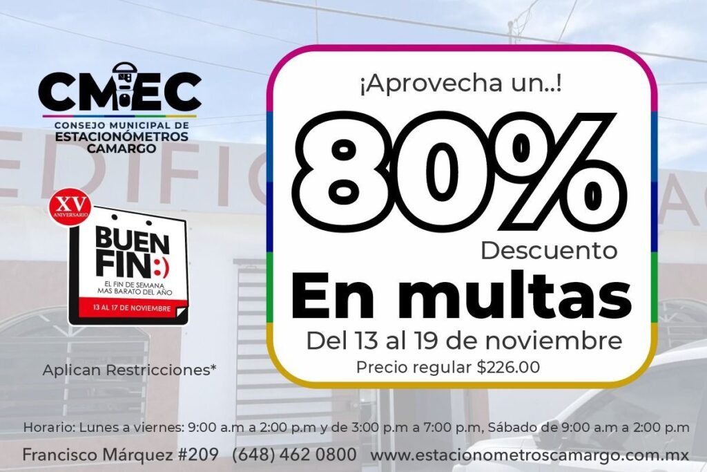El Consejo Municipal de Estacionómetros de Camargo (CMEC) se suma al Buen Fin 2025 con una atractiva promoción para los automovilistas que tengan pendientes con el sistema de parquímetros. Del 13 al 19 de noviembre, se ofrecerá un descuento del 80% en multas, con el propósito de facilitar a la ciudadanía el pago de sus adeudos y fomentar la cultura de cumplimiento.