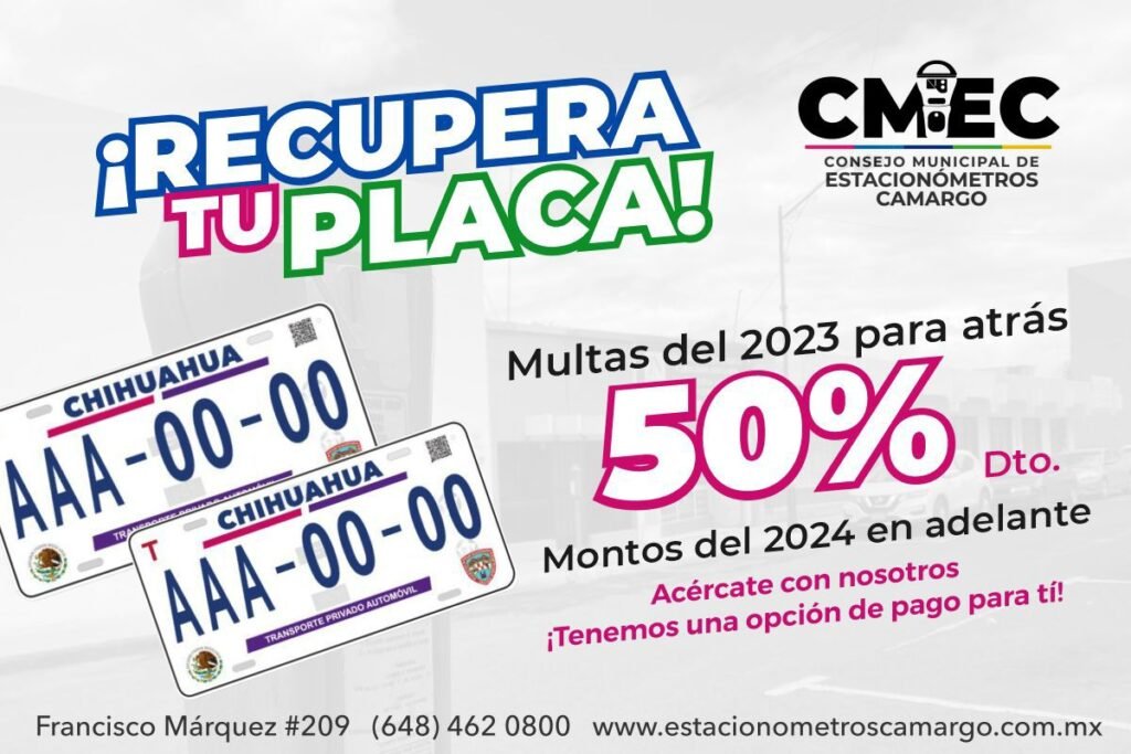 Cd. Camargo, Chih., 01 de Octubre de 2025.– Con el objetivo de brindar facilidades a la ciudadanía, Estacionómetros Camargo anunció el arranque del programa “Recupera tu Placa”, a través del cual los automovilistas que tengan adeudos podrán recuperar sus metales con atractivos descuentos en multas vencidas.