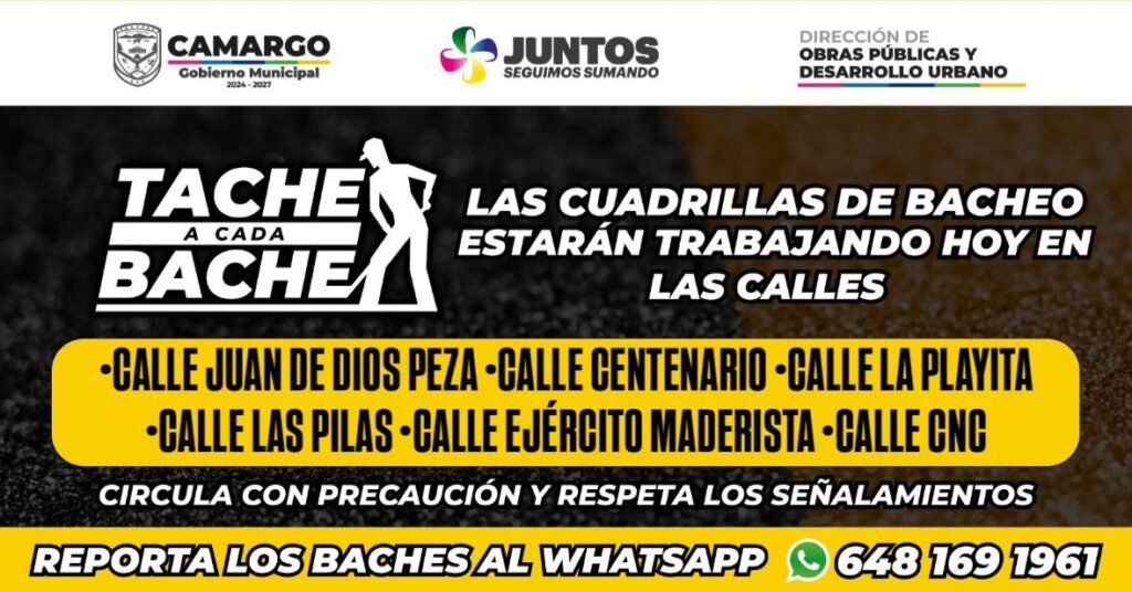 Cd. Camargo, chih., 23 de septiembre de 2025.- Este martes, las cuadrillas de bacheo estarán trabajando en distintos tramos de calles para mejorar el pavimento y garantizar una circulación más segura para todos.