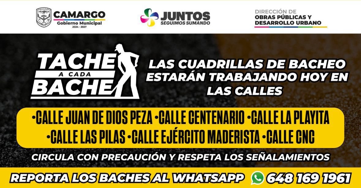 Cd. Camargo, chih., 23 de septiembre de 2025.- Este martes, las cuadrillas de bacheo estarán trabajando en distintos tramos de calles para mejorar el pavimento y garantizar una circulación más segura para todos.