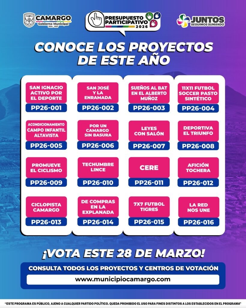 El Gobierno Municipal reiteró la invitación a la ciudadanía a informarse, conocer las propuestas y participar activamente en este ejercicio democrático. Para consultar los proyectos y ubicar los centros de votación, se encuentra disponible la página oficial: www.municipiocamargo.com