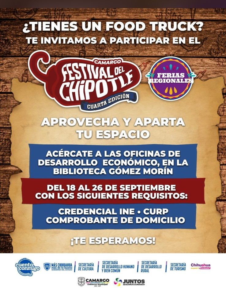Camargo, Chih.- 23 de septiembre de 2025. Con una agenda cultural diversa y la participación de más de 80 expositores, se presentó oficialmente la cuarta edición del Festival del Chipotle, que se llevará a cabo los días 3, 4 y 5 de octubre en el Estadio Alonso Ronquillo de Camargo.