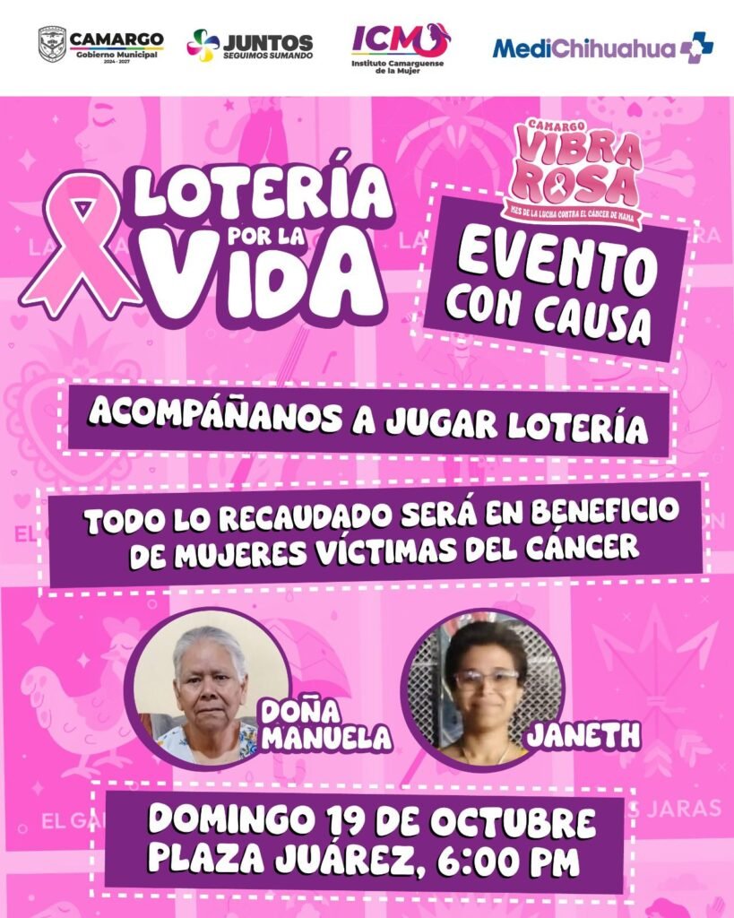 Cd. Camargo, Chih., 19 de Octubre de 2025.- El Gobierno Municipal de Camargo, a través del Instituto Camarguense de la Mujer (ICM), invita a todas las familias a participar en la “Lotería por la Vida”, un evento con causa que se llevará a cabo hoy, domingo 19 de octubre, a las 6:00 de la tarde en la Plaza Juárez.