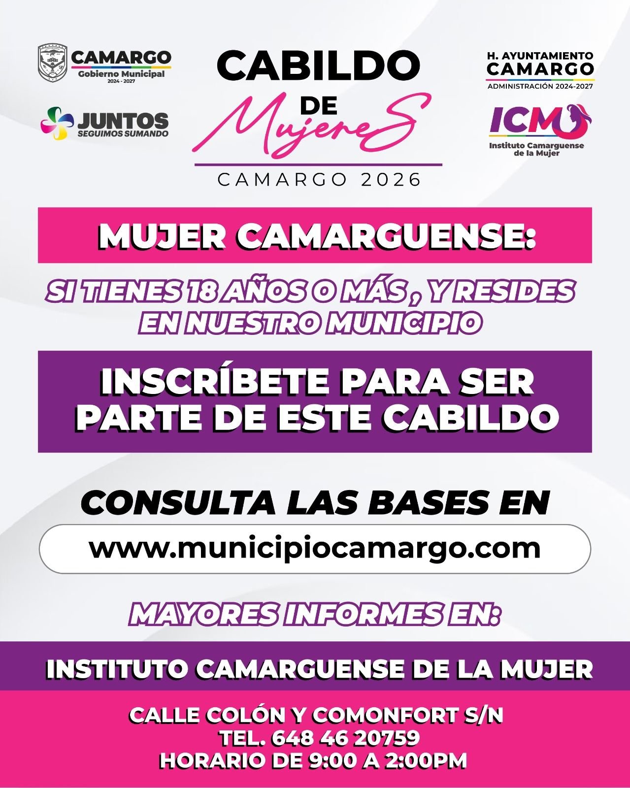 Camargo.- 9 de febrero del 2026. El Gobierno Municipal de Camargo, a través del Instituto Camarguense de la Mujer, invita a las mujeres camarguenses a formar parte del primer Cabildo de Mujeres, un espacio de participación que busca fortalecer la voz, las ideas y las propuestas de las mujeres en la vida pública del municipio.