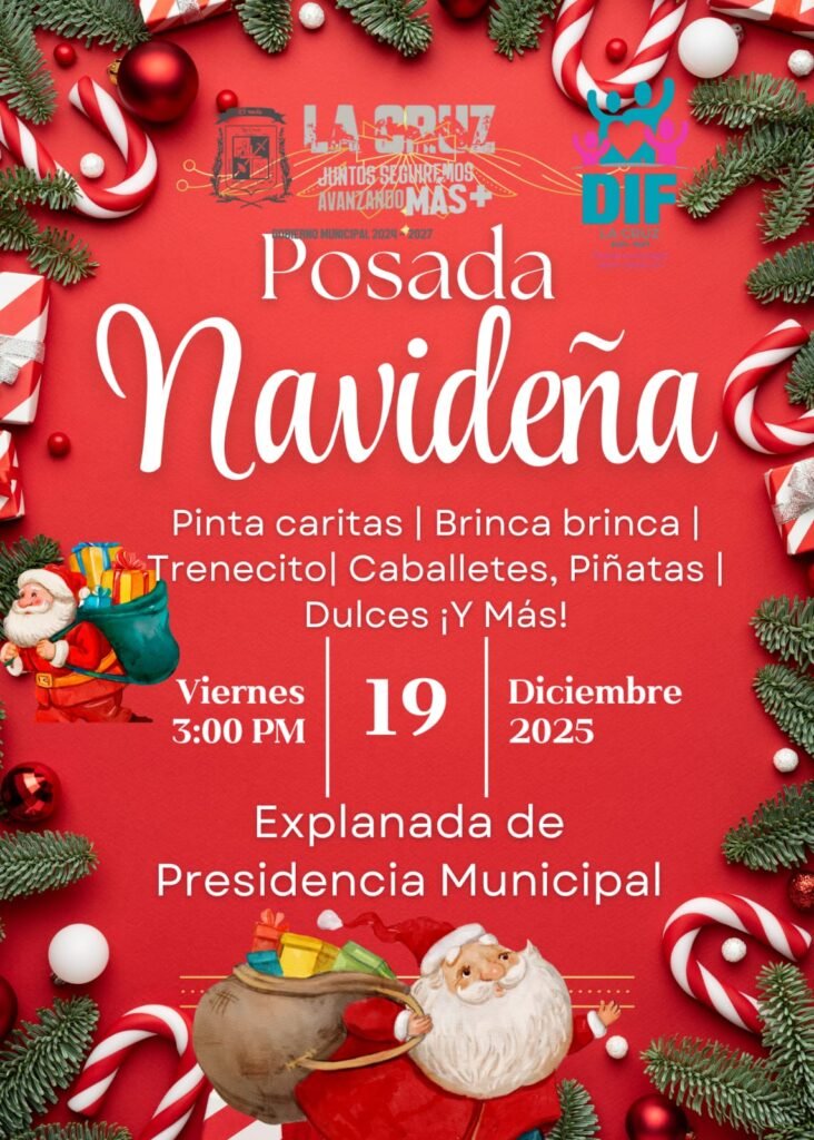 El Gobierno Municipal de La Cruz invita a las familias del municipio a participar en la posada navideña, que se llevará a cabo este día a las 3:00 de la tarde, como parte de las actividades decembrinas.