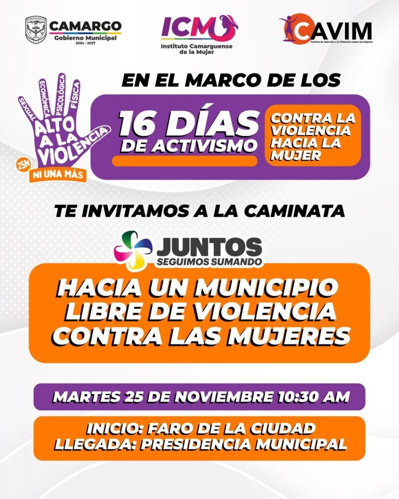 Cd. Camargo, Chih., 24 de Noviembre de 2025.- El Instituto Camarguense de la Mujer (ICM), el Centro de Atención a la Violencia contra las Mujeres (CAVIM) y el Gobierno Municipal de Camargo invitan a sumarse a la caminata en el marco de los 16 Días de Activismo contra la Violencia hacia la Mujer, una iniciativa que busca reforzar las acciones de prevención, atención y sensibilización en torno a la violencia de género.