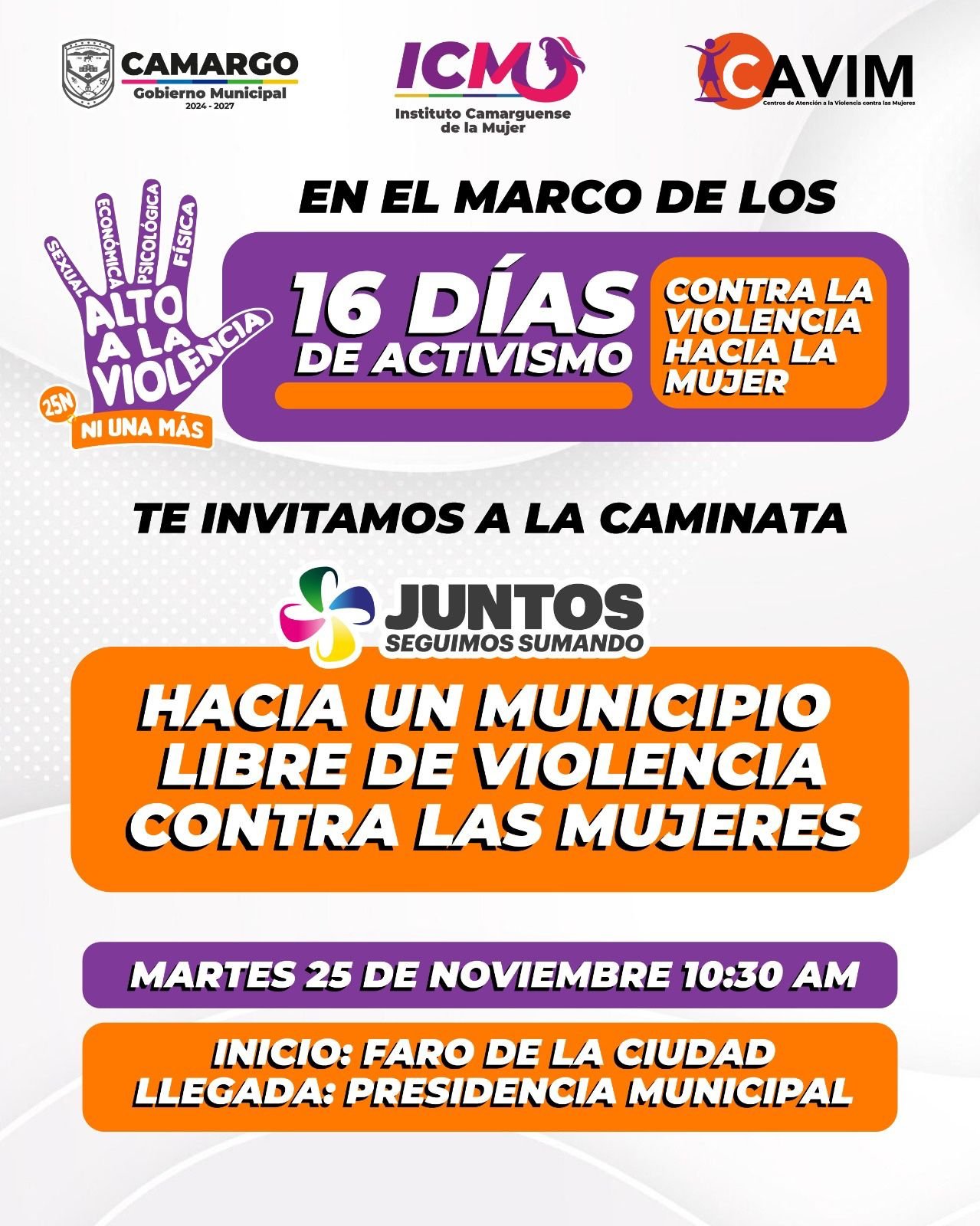 ICM, CAVIM y Gobierno Municipal de Camargo invitan a sumarse este martes a la caminata “Hacia un municipio libre de violencia contra las mujeres”