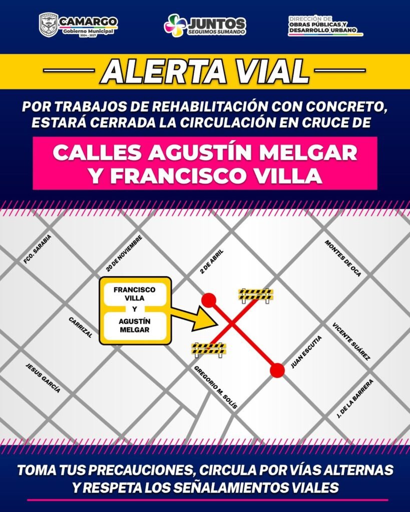 Cd. Camargo, Chih., 20 de Enero de 2026.- El Gobierno Municipal de Camargo inició los trabajos de rehabilitación con concreto hidráulico en el cruce de las calles Agustín Melgar y Francisco Villa, como parte de las acciones permanentes para mejorar la infraestructura vial del municipio.