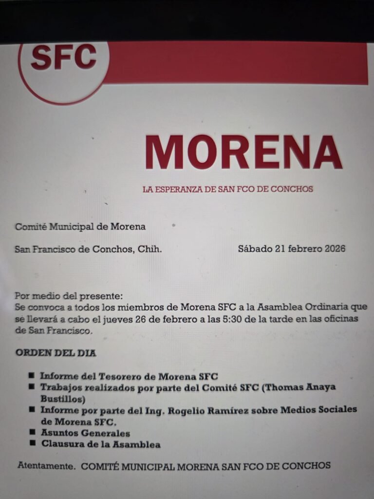 San Francisco de Conchos.- 21 de febrero de 2026. El Comité Directivo Municipal de MORENA en San Francisco de Conchos lanzó la convocatoria para su Asamblea Ordinaria, dirigida a militantes, simpatizantes y ciudadanía en general.
