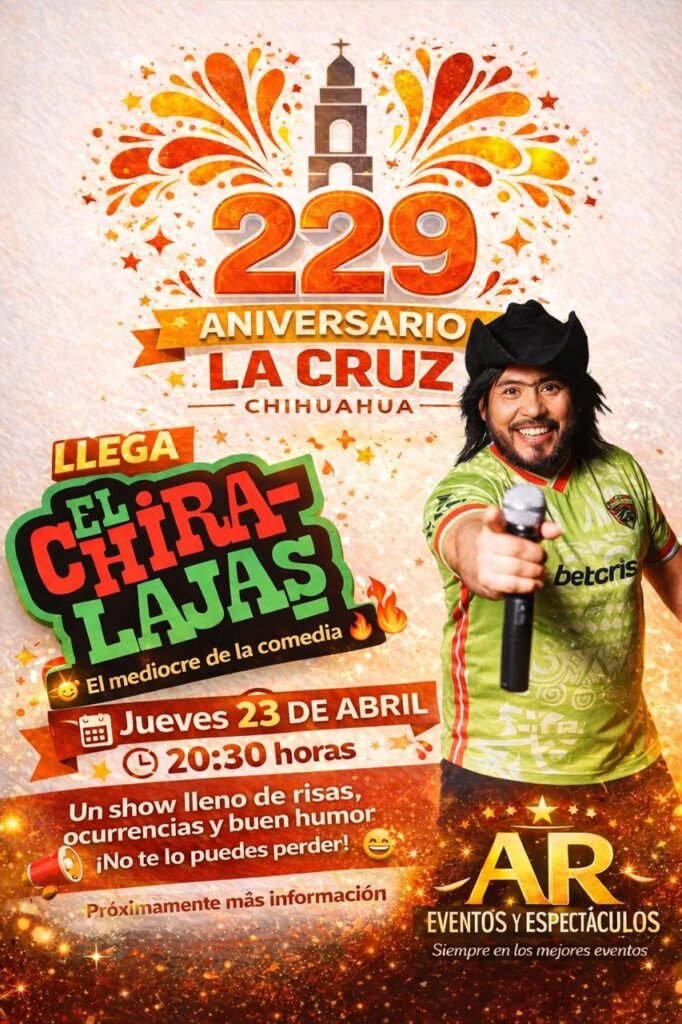 La Cruz.- 23 de abril del 2026. Como parte de las actividades del 229 aniversario del municipio, se prepara una noche llena de risas y diversión con la presentación del comediante El Chiralajas, quien llegará para hacer pasar un momento inolvidable a las familias de La Cruz.