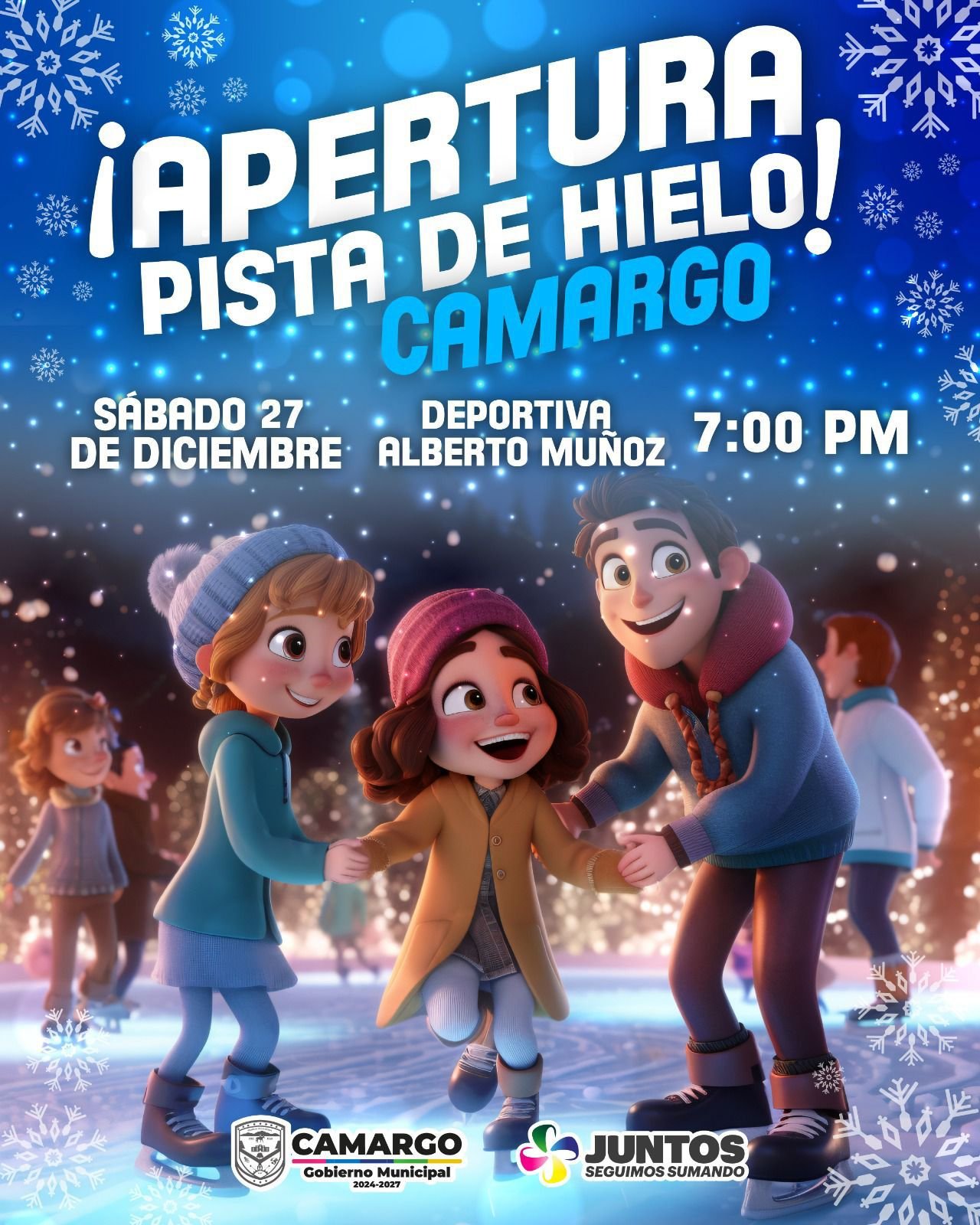 Camargo.- 27 de diciembre del 2025. El Gobierno Municipal de Camargo invita a todas las familias camarguenses a ser parte de una experiencia única, con la apertura de la pista de hielo, un espacio pensado para la convivencia, la diversión y el fortalecimiento del tejido social.