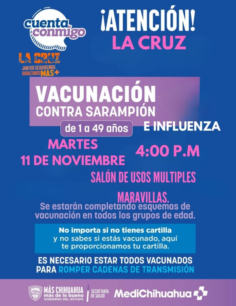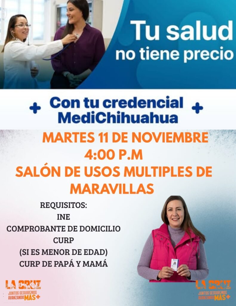 Cd. Camargo, Chih., 10 de Noviembre de 2025.- Este martes la comunidad de Maravillas recibirá la visita de MediChihuahua y del módulo de vacunación, con el objetivo de acercar los servicios de salud a todas las familias de la comunidad.