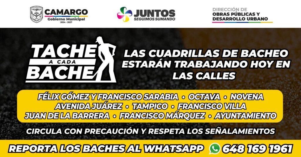 Cd. Camargo, Chih., 01 de Octubre de 2025.- Este miércoles, las cuadrillas de bacheo estarán atendiendo varios puntos de la ciudad con trabajos de asfaltado, con el propósito de mejorar el estado de las calles y ofrecer una circulación más cómoda y segura.