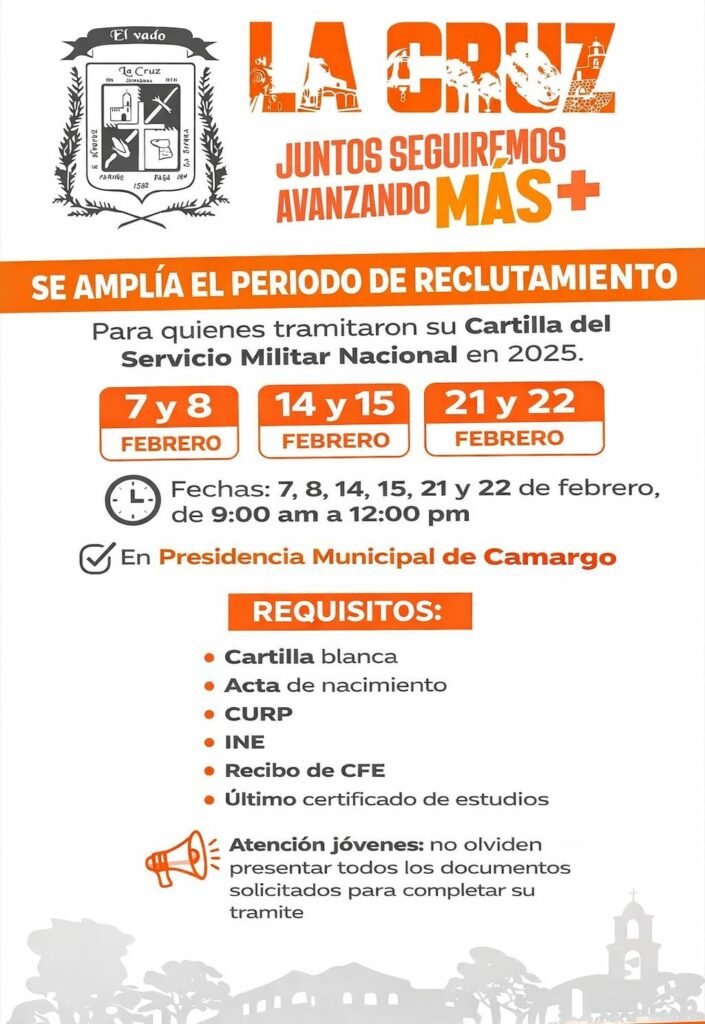 La Cruz, Chih., 27 de Enero de 2026.- El Gobierno Municipal de La Cruz informa a los jóvenes que tramitaron su Cartilla del Servicio Militar Nacional en el año 2025, que se amplía el periodo de reclutamiento, por lo que deberán acudir a completar su proceso en las fechas establecidas.