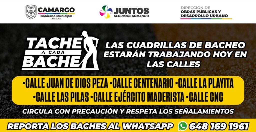 Cd. Camargo, Chih., 22 de Septiembre de 2025.- Hoy lunes, las cuadrillas de bacheo estarán trabajando con asfalto en distintos tramos de vialidades para mejorar su superficie y brindar una circulación más segura.