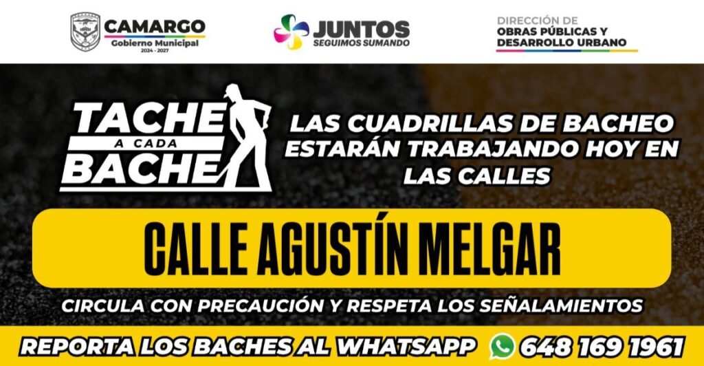 Cd. Camargo, Chih., 17 de Octubre de 2025.- Este viernes, las cuadrillas de bacheo estarán trabajando sobre la Calle Agustín Melgar, desde Ojinaga hasta la Calle Novena, con el propósito de mejorar la superficie y mantener en buen estado esta importante vialidad.