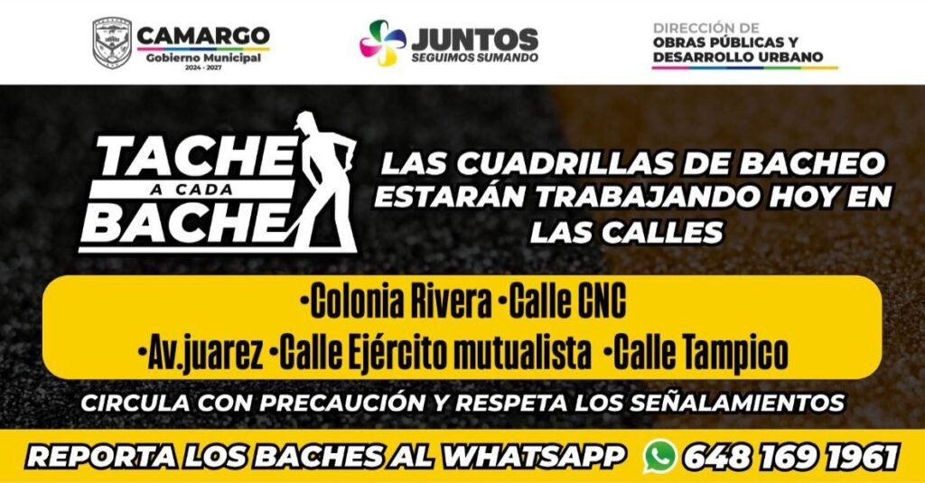 Cd. Camargo, Chih., 25 de Septiembre de 2025.- Este jueves, las cuadrillas de bacheo estarán atendiendo varios tramos con asfalto para mejorar la superficie de rodamiento y favorecer una circulación más segura.
