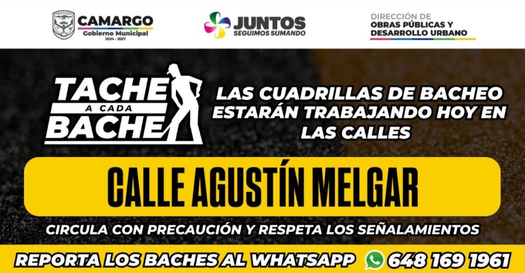 El Gobierno Municipal de Camargo informa que este lunes, las cuadrillas del departamento de Obras Públicas estarán realizando trabajos de bacheo sobre la Calle Agustín Melgar, con el objetivo de mejorar la superficie de rodamiento y mantener en buenas condiciones esta importante vialidad.